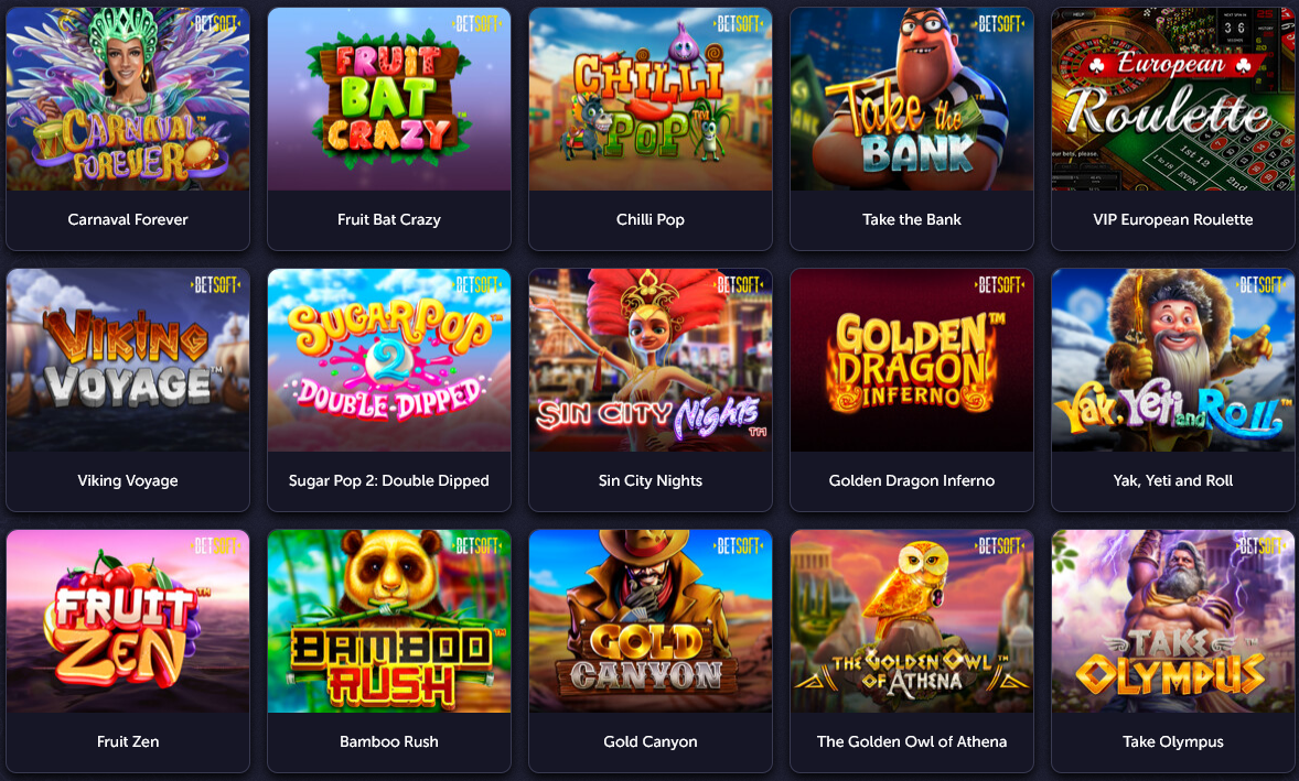 Carnaval Forever Fruit Bat Crazy Chilli Pop Take the Bank VIP European Roulette Viking Voyage Sugar Pop 2: Double Dipped Sin City Nights Golden Dragon Inferno Yak, Yeti and Roll Fruit Zen Bamboo Rush Gold Canyon The Golden Owl of Athena Take Olympus Spring Tails Woodlanders Faerie Spells Sugar Pop Charms & Clovers Spinfinity Man Stampede Lost Mystery Chest Book of Darkness 88 Frenzy Fortune Rags to Witches 7 Fortune Frenzy The Angler Wolf Moon Rising Super Sweets Pai Gow Lava Gold Primal Wilderness Sleighin' it Caishen’s Arrival Stacked Dim Sum Prize Take the Kingdom Take Santa's Shop Jungle Stripes Golden Horns Thai Blossoms Monster Pop Wild Drops Primal Hunt Winds of Wealth Mr. Macau Back to Venus! Total Overdrive Tower of Fortuna Triple Juicy Drops Return to Paris Safari Sam 2 Alkemor's Elements Stay Frosty! Kensei Blades The Mystic Hive The Hive Hat Trick Hero